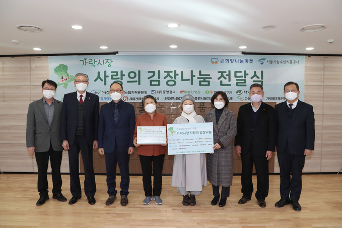 이날 전달식에는 가락시장 김장 나눔 활동이 오랜 기간 지속될 수 있도록 아낌없는 후원과 지원을 해오고 있는 청과도매시장법인, 수산도매시장법인, 중도매인단체, 하역단체, 가락몰 임대상인 등 가락시장 유통인이 함께하여 이웃 사랑을 실천하는 뜻깊은 시간이 되었다.