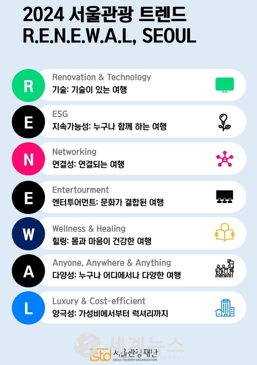 [세계뉴스 전승원 기자] 서울관광재단(대표이사 길기연)은 본격적인 관광 재개와 기술변화에 맞춰 2024년 서울의 관광 트렌드 “R.E.N.E.W.A.L”을 발표했다.