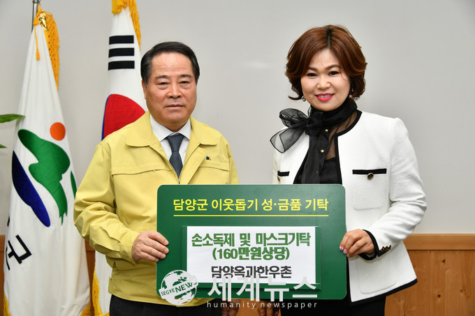 [세계뉴스 한차수 기자] 담양군은 담양옥과한우촌(대표 김해란)에서 최근 코로나19 극복을 위해 써달라며 손세정제 및 마스크를 기탁했다.