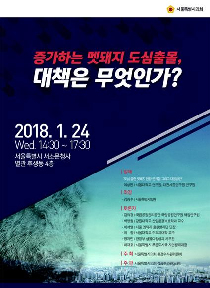 [세계뉴스] 전승원 기자 = 서울특별시의회 환경수자원위원회 김광수 의원(국민의당, 노원5)은 24일 오후 2시30분 서소문청사 별관 후생동 4층에서 ‘증가하는 멧돼지 도심출몰’ 대책은 무엇인가? 토론회를 개최한다.